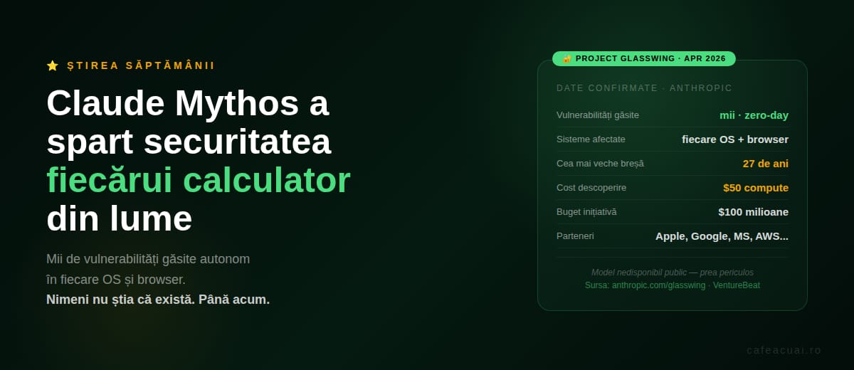 Bine ai venit la Ediția #7 a La CAFEA cu AI. Ediția de azi are probabil cea mai importantă știre AI din tot anul 2026. Nu e hype — e confirmată oficial de Anthropic cu detalii tehnice, cu parteneri ca Apple, Google și Microsoft, și cu implicații directe pentru securitatea fiecărui calculator, telefon și browser pe care îl folosești tu acum.