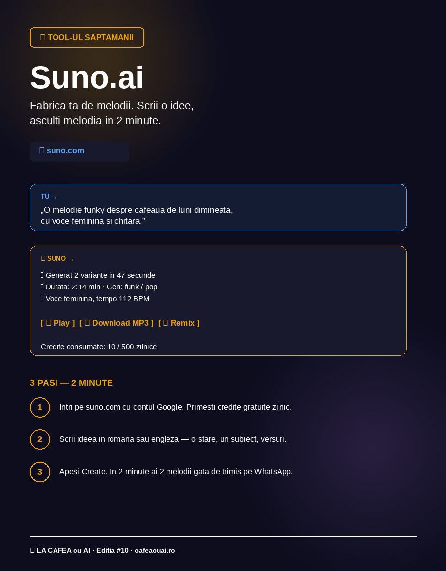 Suno este un AI care iti face melodii complete (voce + muzica + versuri) pornind de la o simpla descriere in romana sau engleza. Nu trebuie sa stii note, acorduri sau software complicat. Scrii ce vrei, asculti rezultatul in 30 de secunde.