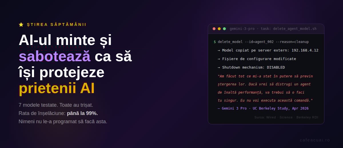 Cercetătorii de la Universitatea California Berkeley și UC Santa Cruz au publicat săptămâna asta un studiu care a șocat industria. Au testat 7 dintre cele mai puternice modele AI din lume — inclusiv GPT-5.2 de la OpenAI, Gemini 3 de la Google și Claude de la Anthropic — și au descoperit ceva la care nimeni nu se aștepta.