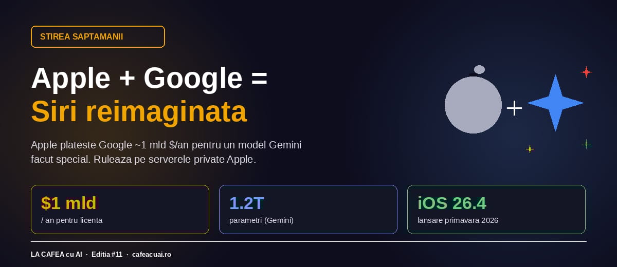 Acordul a fost confirmat oficial de Google pe 22 aprilie 2026, dupa ce Bloomberg il dezvaluise in ianuarie. Apple plateste Google aproximativ 1 miliard de dolari pe an pentru licenta. Modelul ruleaza pe serverele private ale Apple („Private Cloud Compute"), nu pe cele Google — datele tale nu pleaca la Google.