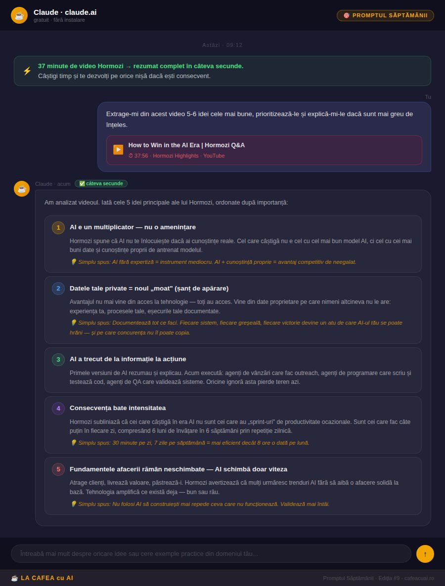 De testat chiar azi: încearcă cu orice video, eu am folosit videoul lui Hormozi „How to Win in the AI Era" (37 minute): youtube.com/watch?v=94XFE1lijP0