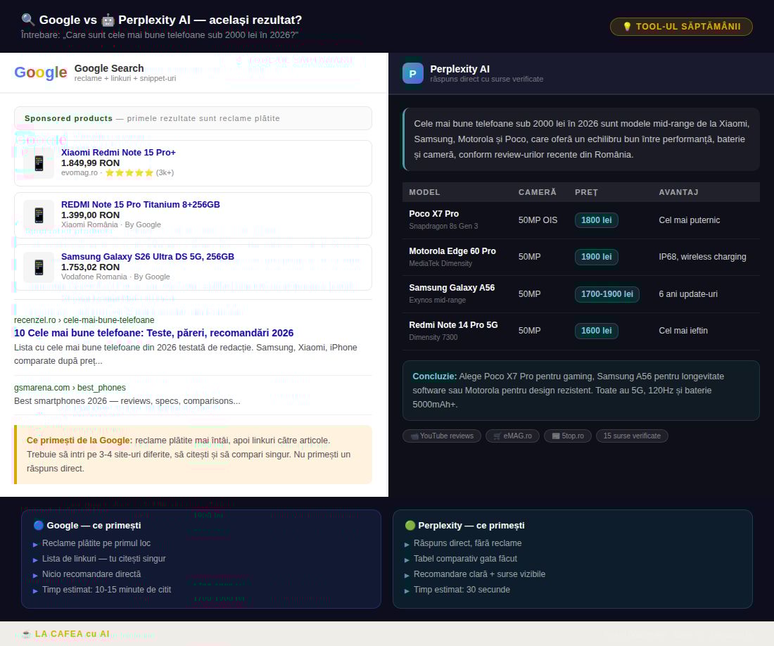 Exemplu real: am întrebat „Care sunt cele mai bune telefoane sub 2000 lei în 2026?" pe Google și pe Perplexity în același timp. Google a afișat reclame plătite și o listă de linkuri. Perplexity a dat instant un tabel cu 5 telefoane, prețuri reale în lei și o recomandare clară — în 30 de secunde.