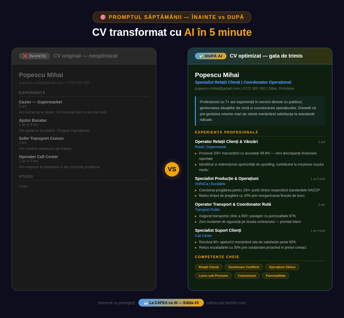 Uită-te mai jos la exemplul concret — același om, aceeași experiență, CV complet diferit după AI. 👇